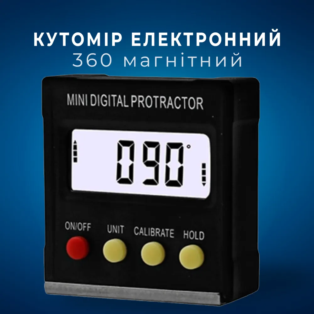 Кутомір-рівень із цифровою індикацією. Дозволить швидко і точно визначити кут відхилення поверхні, що вимірюється по горизонталі або вертикалі. Завдяки магнітній основі легко кріпиться до металевих поверхонь.