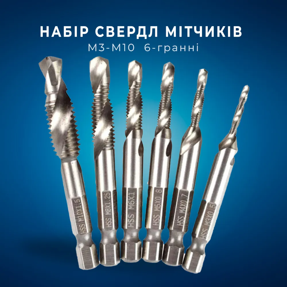 Теги: Набір свердел мітчиків, свердла-мітчики, нарізання різьблення, метрична різьба, різьбонарізний інструмент, M3, M4, M5, M6, M8, M10, HSS сталь, hex 6.35 мм, для слюсарних робіт, комплект 6 шт, інструмент для ремонту, підготовка отворів під різьбу, 160785, 159483, SviLand